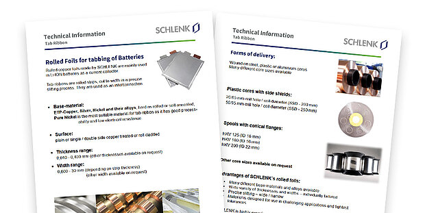 Tab ribbons are rolled metal strips, precisely cut to width. Tabs can be used to connect the electrodes within the battery itself or as a connection to the battery terminal. SCHLENK is a specialist for customized connectors with narrow tolerances and with an excellent surface quality for challenging applications.